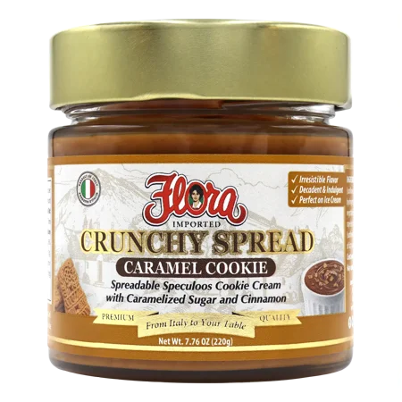 Flora Fine Foods Caramel Cookie Crunchy Spread – A crunchy decadent cookie cream made from caramelized sugar and cinnamon. Flora?s Caramel Cookie Spread brings the taste of Italy to your table with every spoonful?perfect on toast in desserts or straight from the jar.