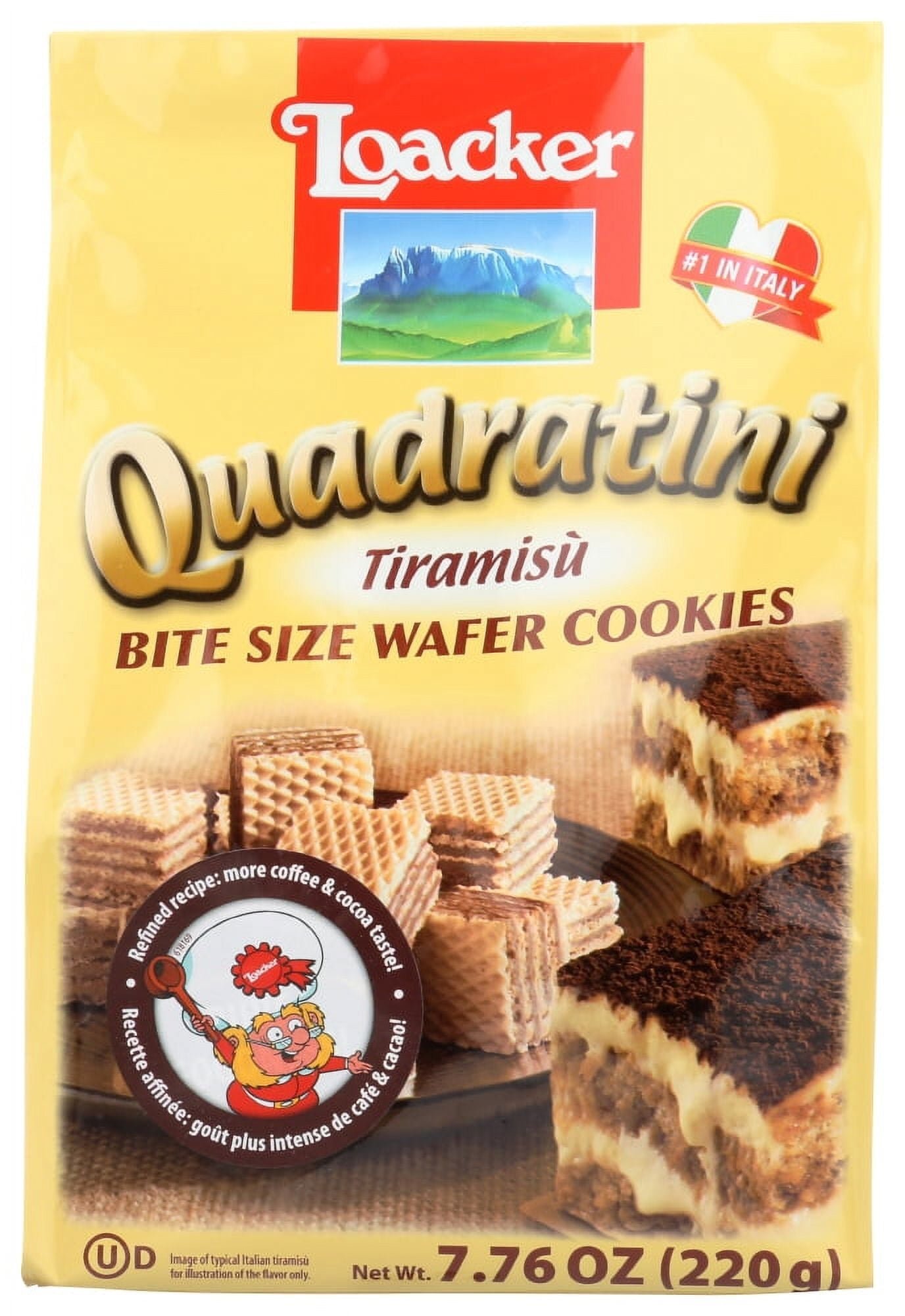 Loacker BITE SIZE WAFER COOKIES – INGREDIENTS: INGREDIENTS: UNBLEACHED WHEAT FLOUR, COCONUT OIL, WHEY POWDER (MILK), SUGAR, SKIMMED MILK POWDER, CREAM POWDER, SOY FLOUR, GLUCOSE SYRUP, COCONUT FLAKES, BARLEY MALT EXTRACT, DEXTROSE, HAZELNUTS, COCOA PROCESSED WITH ALKALI, MASCARPONE POWDER (MILK), COFFEE POWDER, LEAVING AGENTS (SODIUMHYDROGEN CARBONATE, DISODIUM DIPHOSPHATE), EMULSIFIER, SPICES, NATURAL VANILLA PODS.